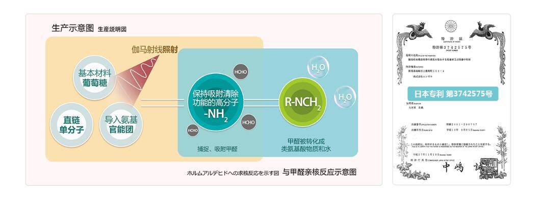 荃芬采用的是日本專利(專利第3742575號)氨基除甲醛解決方案。產品基本原料是葡萄糖等安全物質,原料經過伽馬射線照射,生成穩(wěn)定的氨基高分子聚合物,捕捉、吸附空氣中的甲醛,并與其反應生成類氨基酸物質與氣態(tài)水。