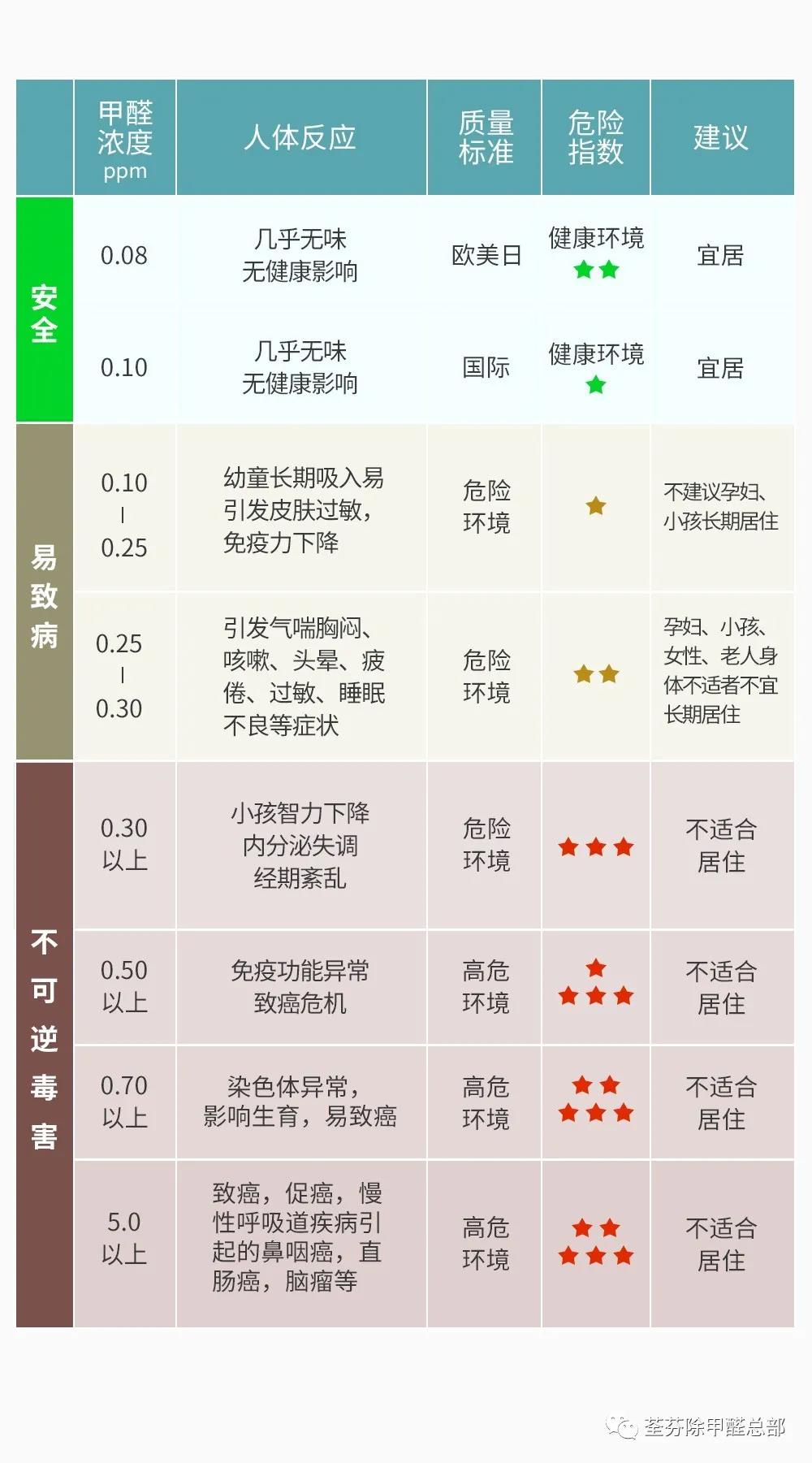 我們國家規(guī)定的甲醛標(biāo)準(zhǔn)限值是0.1㎎/m3,室內(nèi)甲醛超標(biāo)對人體的危害不可小覷。甲醛是一種無色有刺激性氣味的氣體,對于普通人來說,只有當(dāng)甲醛的濃度超標(biāo)3倍以上才可能聞到味道,這一點也是許多受害者受到甲醛危害的原因,認(rèn)為聞不到味了就是沒甲醛了。(溫度為0℃時,1PPM=0.74666 mg/m3)