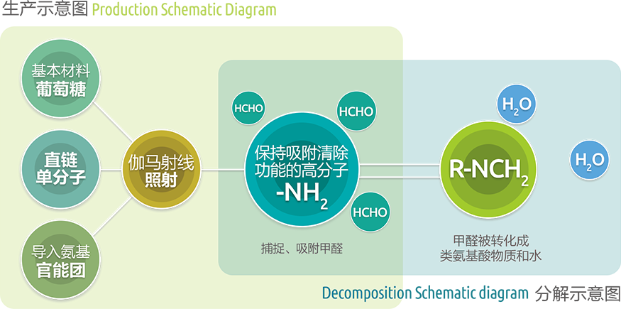 基本原料是葡萄糖等安全物質(zhì),原料經(jīng)過伽馬射線照射,生成穩(wěn)定的氨基高分子聚合物,捕捉、吸附空氣中的甲醛,并與其反應(yīng)生成類氨基酸物質(zhì)與水。整個(gè)反應(yīng)過程安全高效,反應(yīng)后無任何有害物質(zhì)生成。